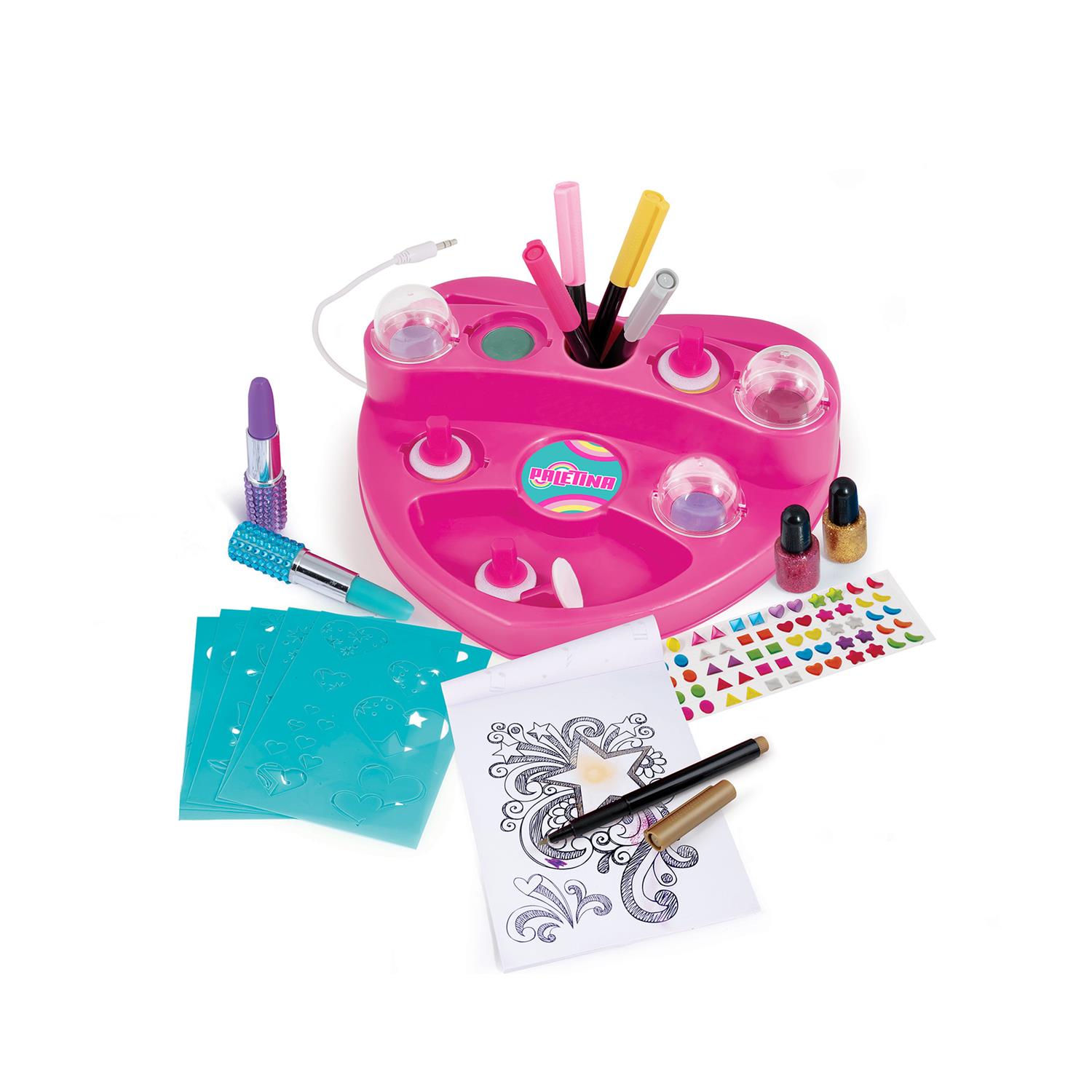| Box Contents | Hars-Shape Drawing Palette, 6 Powder Paints, 6 Brushes-Sponges, 6 Stencil Sheets, 5 Markers, 1 Lipstick Markers, 2 Bottles Glitter Glue, Drawing Pad, 3D Decorative Stickers |
